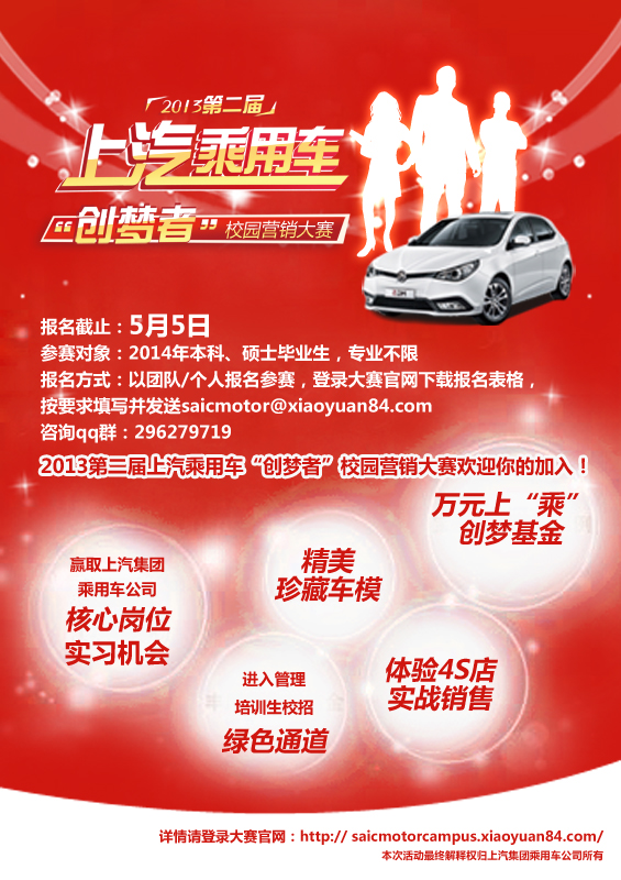 2013第二届上汽乘用车“创梦者”校园营销大赛报名最后2周(5月5日截止),没报名的同学抓紧时间哦!