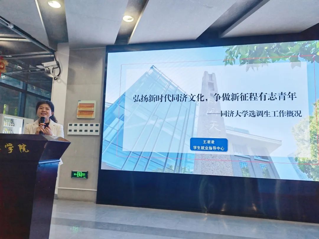 首先王凌凌老师作了关于同济大学选调生基层发展情况的报告,对同济大学往届选调生基层发展情况进行了分析,分享了典型代表的成长经历,并对报考同学给出了若干建议。