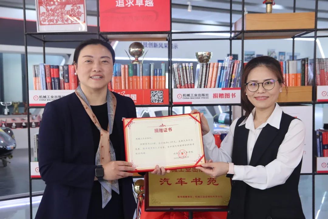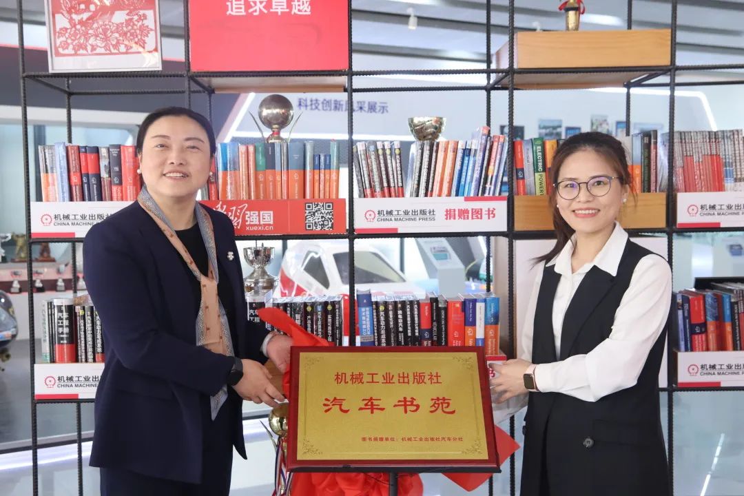 座谈会后,同济大学汽车学院党委书记曹静和机械工业出版社汽车分社赵海青社长为机械工业出版社“汽车书苑”揭牌。机械工业出版社汽车分社向同济大学汽车学院捐赠了近三百册中外文图书,曹静书记向赵海青社长颁发了捐赠证书。