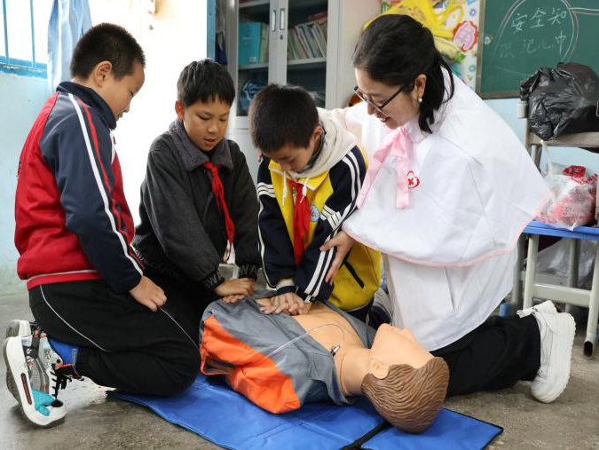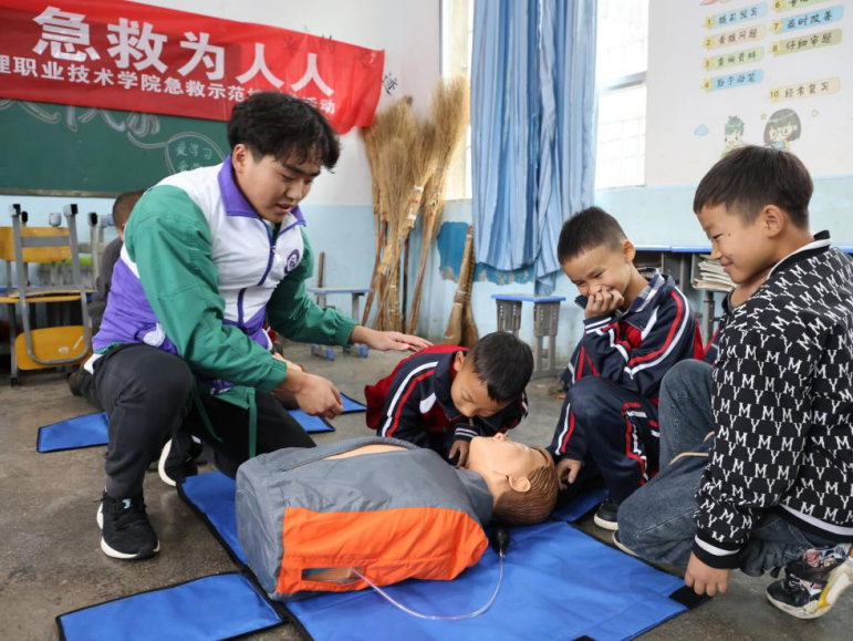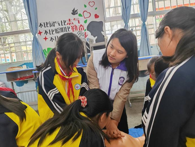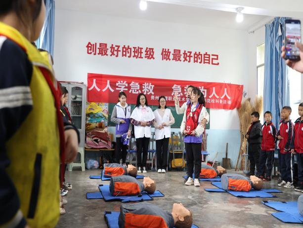 在龙场小学,为进一步加强乡村健康科普教育和健康促进工作,有效将急救知识、安全知识和健康知识推广覆盖到更多群体,营造“人人学急救,急救为人人”的良好社会氛围,助力乡村振兴,学院教师及学生代表走进教室。他们运用通俗易懂的语言,结合常见的案例,为龙场小学学生详细讲解了“海姆立克急救法”和“心肺复苏术”产生背景、使用场景、操作方法及注意事项等,并邀请小学生们进行现场模拟操作,手把手进行指导,激发了小学生们浓厚的学习兴趣。