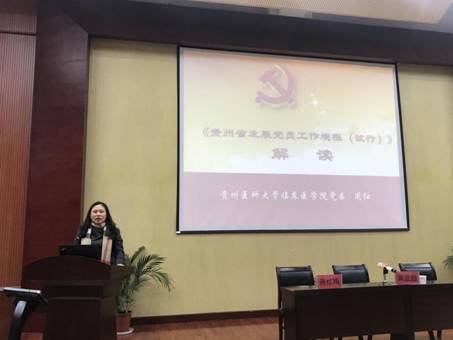 讲座上,贵州医科大学临床医学院党委书记周红为全体教师作了《贵州省发展党员工作规程(试行)》解读的专题讲座。她从发展党员工作的指导原则、新时代发展党员的核心要求、规程要点及发展党员工作规程的五个阶段、25项程序为大家作了详细的解读。讲座内容丰富而细致,帮助我院教师深入解了“基层党组织建设”的相关内容,对我院后续开展发展教师和学生党员的工作具有重要指导作用。