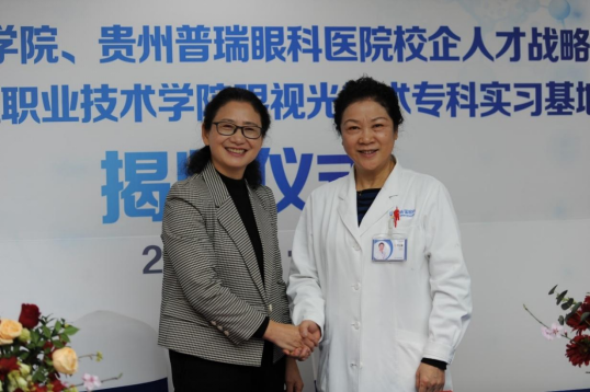 2021年2月26日上午10时,在贵州普瑞眼科医院,我院与贵州普瑞眼科医院隆重举行了校企合作签约及揭牌仪式。学院江智霞院长、潘忠伦副院长、柏晓玲副院长,贵州普瑞眼科医院李志敏院长、张唯伟副院长、姜仲阳行政院长,以及双方相关职能部门负责人及工作人员参加了签约、揭牌仪式。