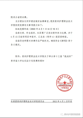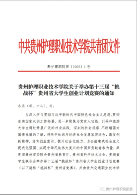 为深入学习贯彻习近平新时代中国特色社会主义思想,贯彻落实国家双创工作部署,进一步聚焦为党育人功能,引导和激励大学生通过开展广泛的社会实践、深刻的社会观察,不断增强对国情社情的了解,将所学知识与经济社会发展紧密结合,激发创新精神,培育创业意识,提升社会化能力,为全面建成社会主义现代化强国、实现中华民族伟大复兴的中国梦贡献青春力量,共青团贵州省委联合贵州省教育厅、贵州省科学技术协会、贵州省学生联合会举办第十三届“挑战杯”贵州省大学生创业计划竞赛(以下简称“挑战杯”贵州省竞赛),并由贵州交通职业技术学院承办省级决赛。