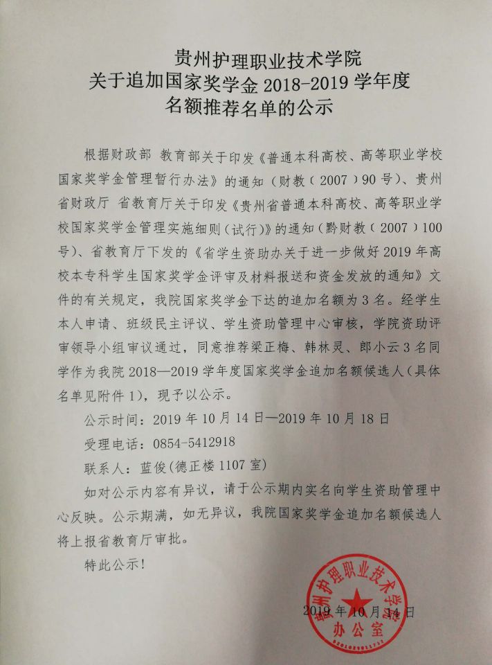关于追加国家奖学金2018-2019年度推荐名单公示