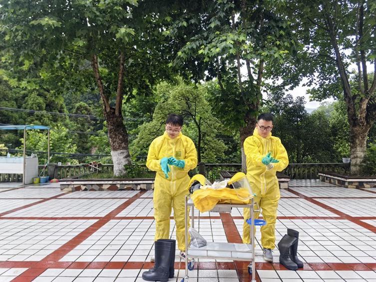 演练开始前,应急救援人员进行了防护帽、防护口罩、防护手套和防护服等个人防护装备的现场穿脱操作。