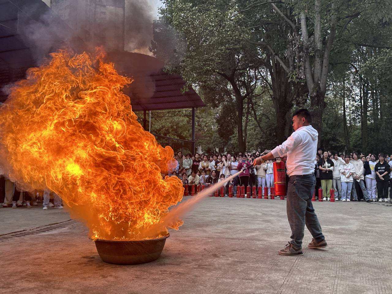 演练结束后,工作人员向学生介绍了灭火器的构造和使用方法,并进行了现场灭火示范,随后教师及学生代表分别使用灭火器进行灭火实操。