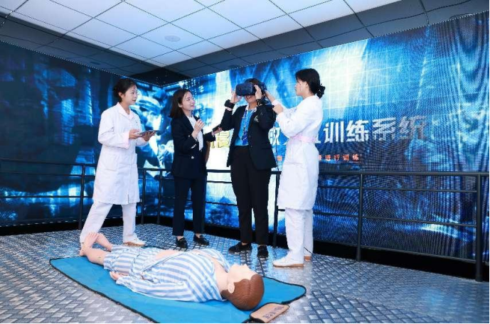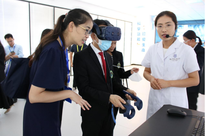 活动上,我院展示了沉浸式灾难急救训练、护理急救技能VR课程及虚拟仿真学习资源等,体现了虚拟仿真技术在医学护理急危重症教学中的重要作用。嘉宾们沉浸式体验虚拟仿真设备,对虚拟仿真教学表现出浓厚的兴趣,希望能够深入了解虚拟仿真技术在教学中的应用。