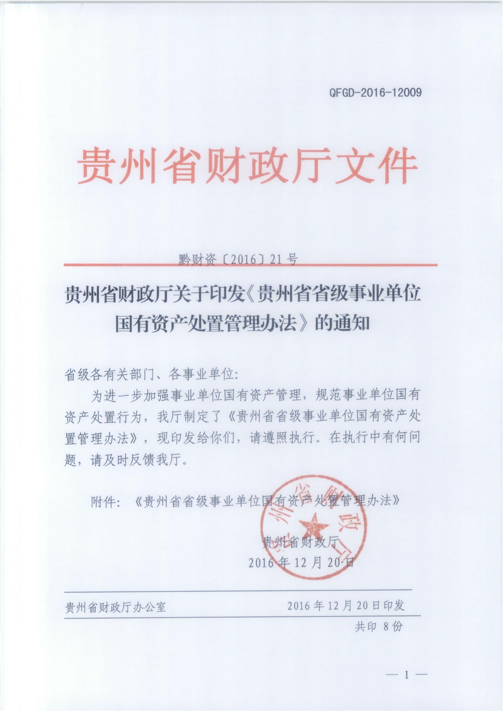 贵州省财政厅关于印发《贵州省省级事业单位国有资产处置管理办法》的通知 ( 黔财资【2016】21号)