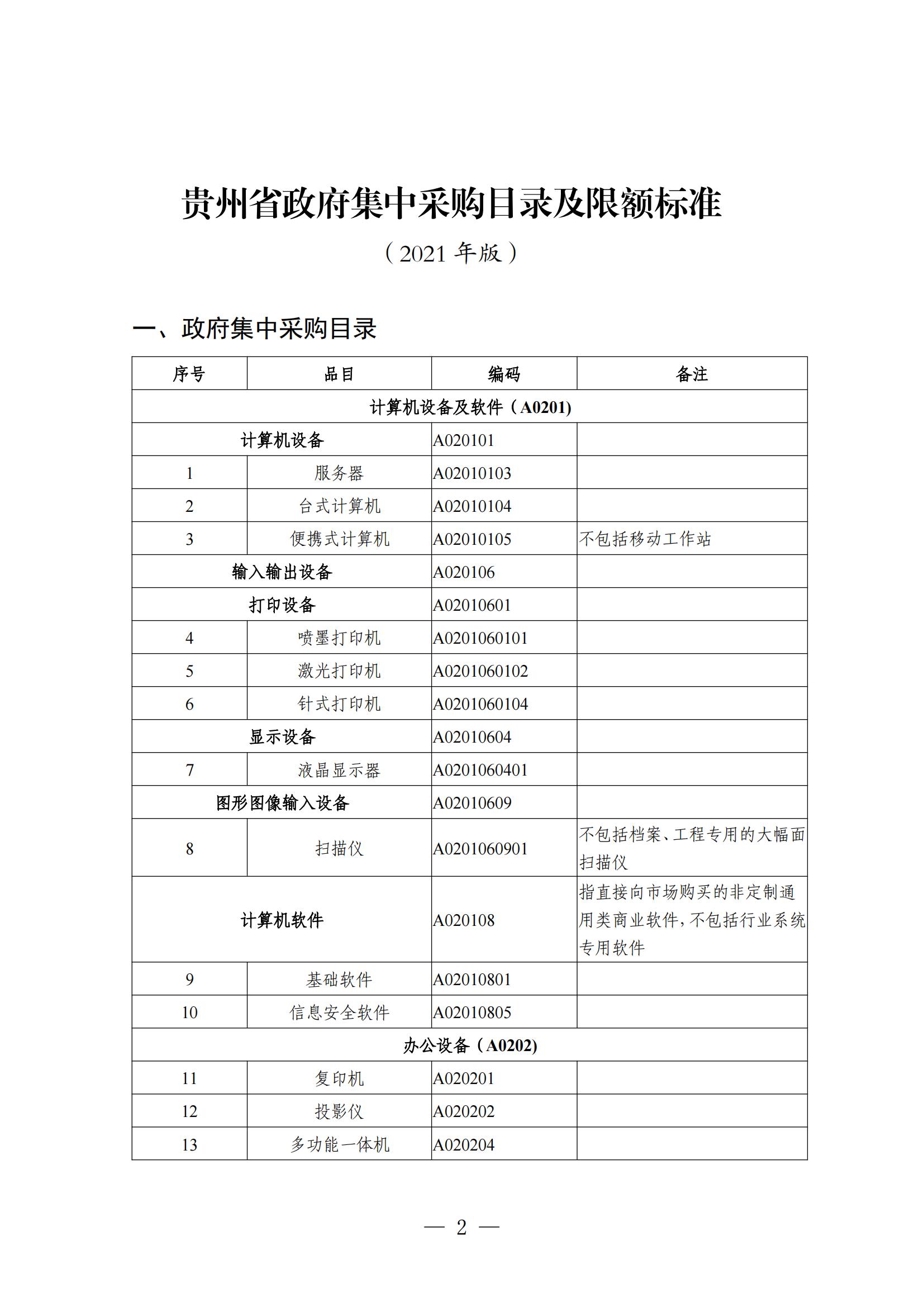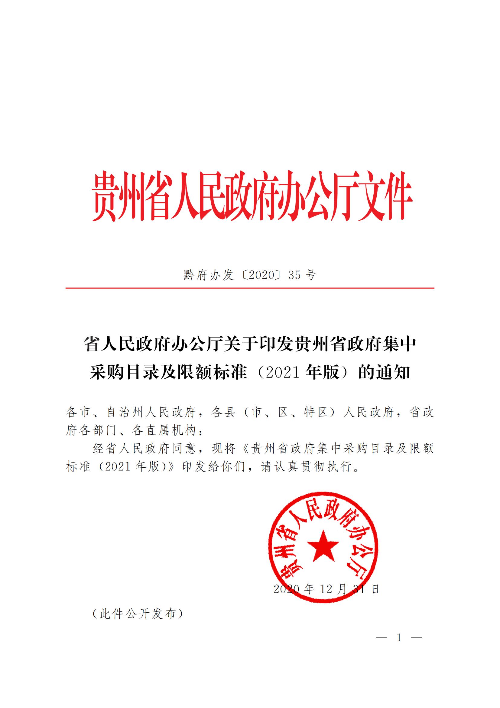 《省人民政府办公厅关于印发贵州省政府集中采购目录及限额标准(2021年版)的通知》(黔府办发〔2020〕35号)