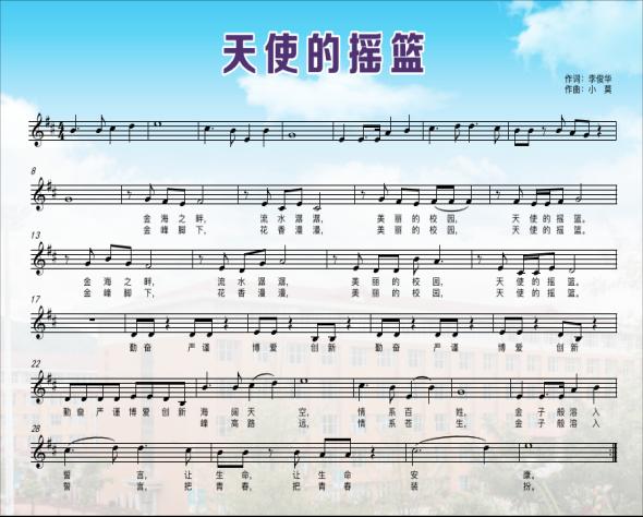 第一百条 校歌名称为《天使的摇篮》,词作者李俊华,曲作者小莫。