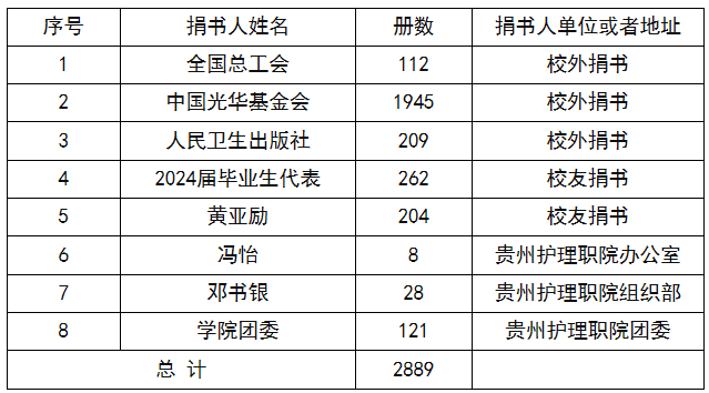 学校图书馆自开展共建“书香校园”捐书活动以来,陆续收到广大师生、各界人士、社会团体的踊跃捐赠。2024年1月至12月期间,共收到捐赠图书2889册,现公布如下: